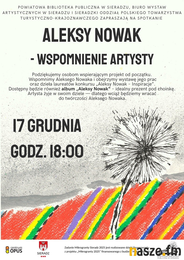 W bibliotece powiatowej w Sieradzu na środę zaplanowano kolejne spotkanie poświęcone Aleksemu Nowakowi. Będzie okazja do rozmów, wspomnień i obejrzenia prac artysty. Początek o godz. 18:00.