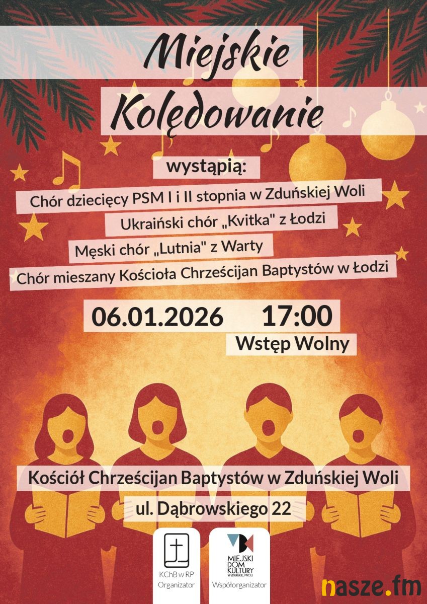 Miejskie Kolędowanie w Zduńskiej Woli będzie we wtorek 6 stycznia 2026 r. o godzinie 17:00, w Kościele Chrześcijan Baptystów w Zduńskiej Woli, ul. Dąbrowskiego 22. Wstęp wolny.