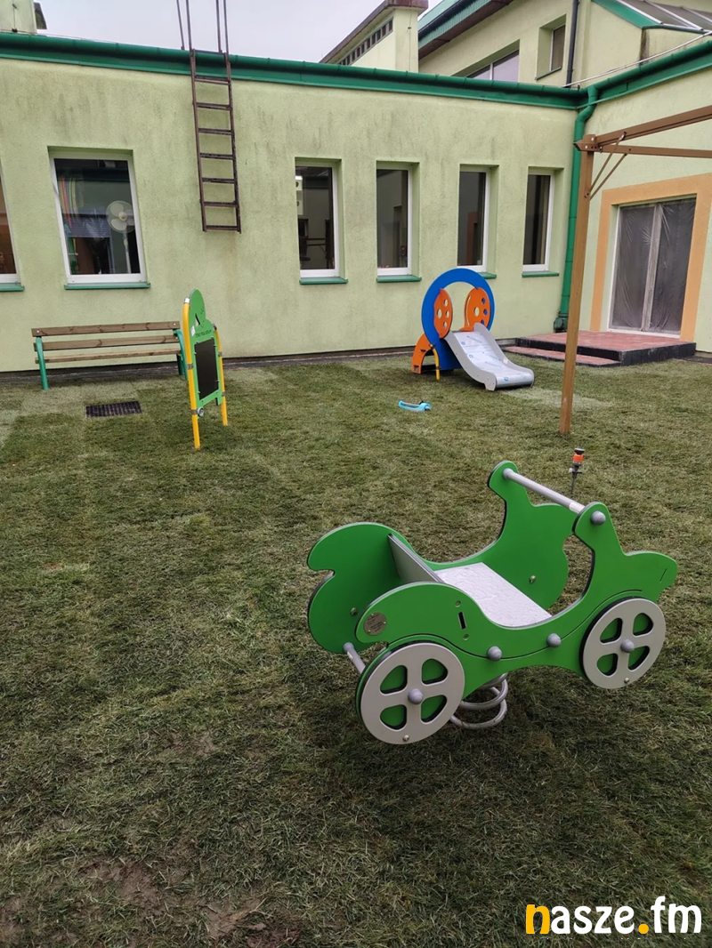 Ułożona została opaska oraz obrzeża z kostki betonowej. Zdemontowano i usunięto stare zabawki. Zakupione zostało nowe wyposażenie do ogrodu i strefy sensorycznej żłobka dla najmłodszych dzieci w wieku do lat 3.