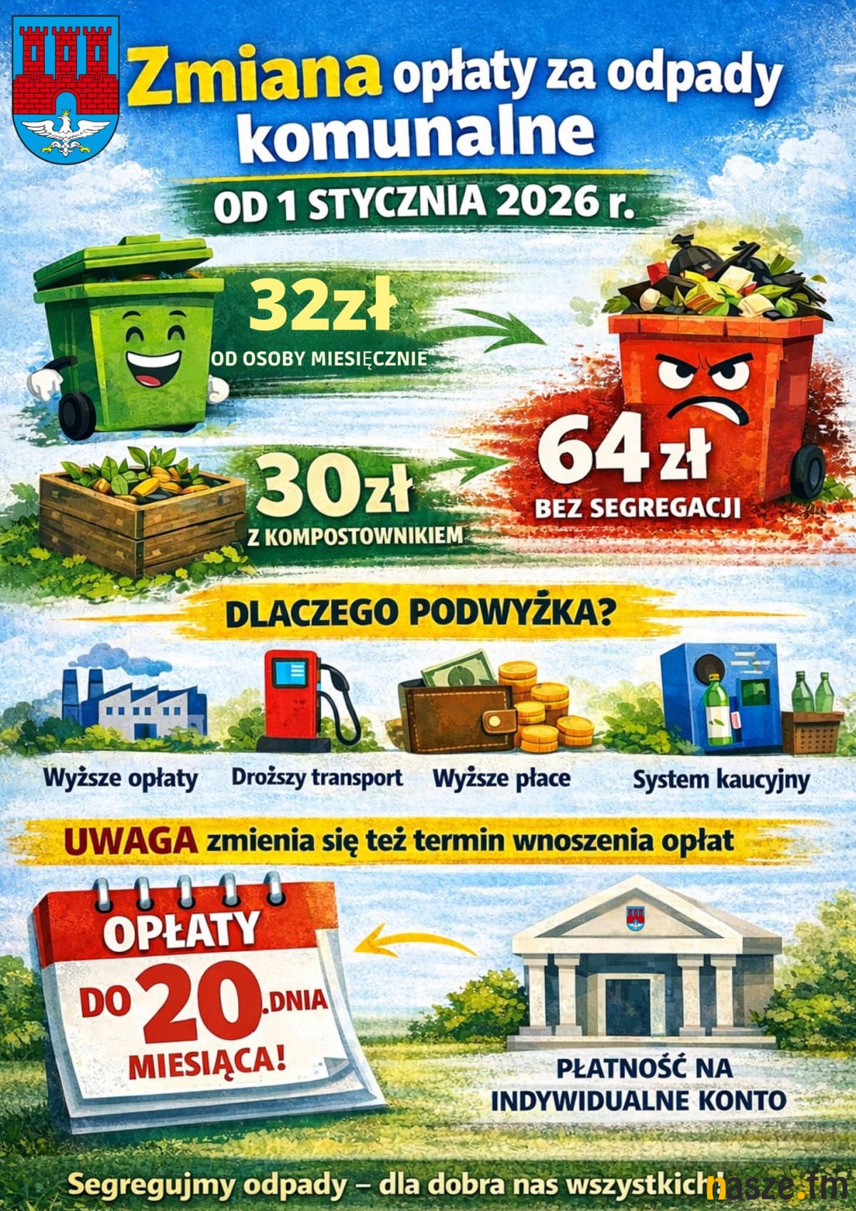 Przez ostatnie lata gmina utrzymywała stawki bez zmian - obecna korekta jest konieczna, aby system odbioru odpadów mógł funkcjonować bez zakłóceń . Brak segregacji odpadów powoduje zastosowanie opłaty podwyższonej - 64 zł od osoby.