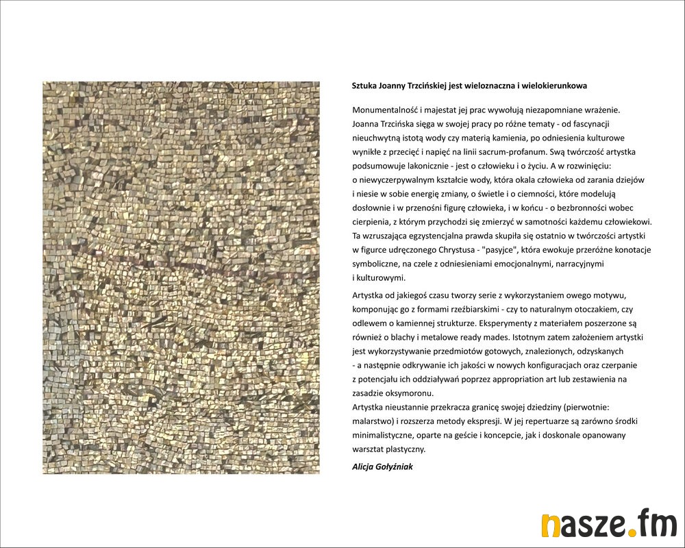Artystka sięga w swoich pracach po różne tematy - od fascynacji nieuchwytną istotą wody czy materią kamienia, po odniesienia kulturowe wynikłe z przecięć i napięć na linii sacrum - profanum.