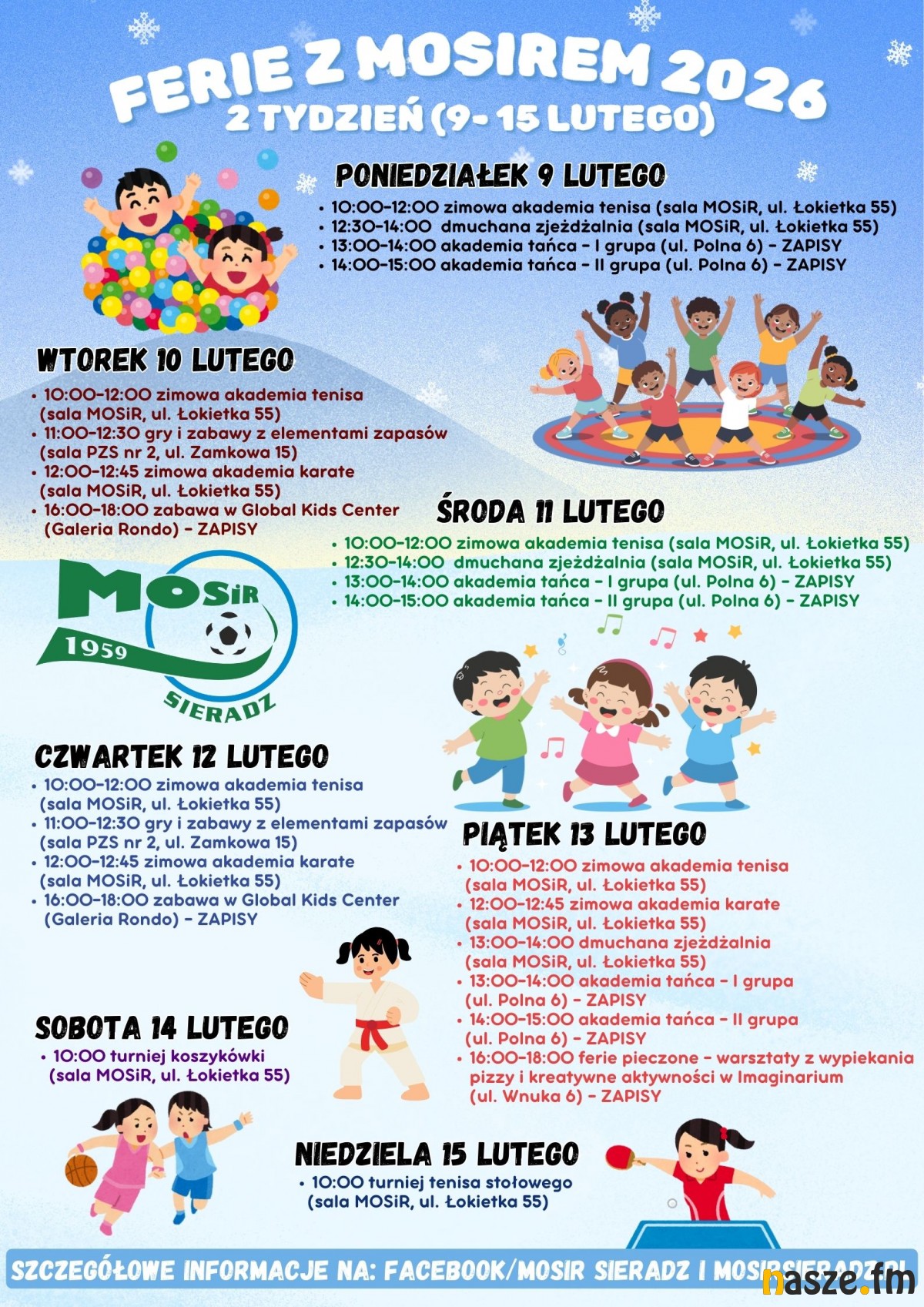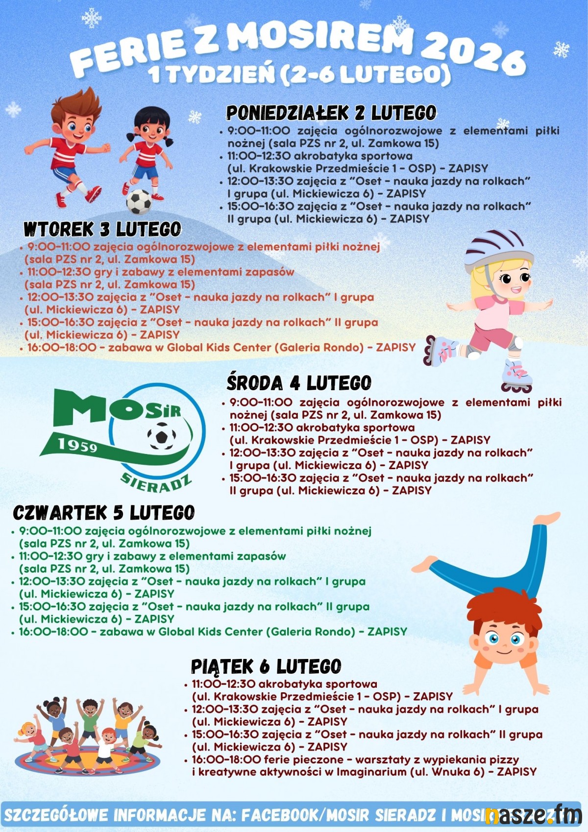 - 16:00-18:00- zajęcia w sali zabaw Global Kids Center (Galeria Rondo, ul. Jana Pawła II 3), zapisy od 26.01 na dzialsportu@mosirsieradz.pl (limit 40 miejsc)