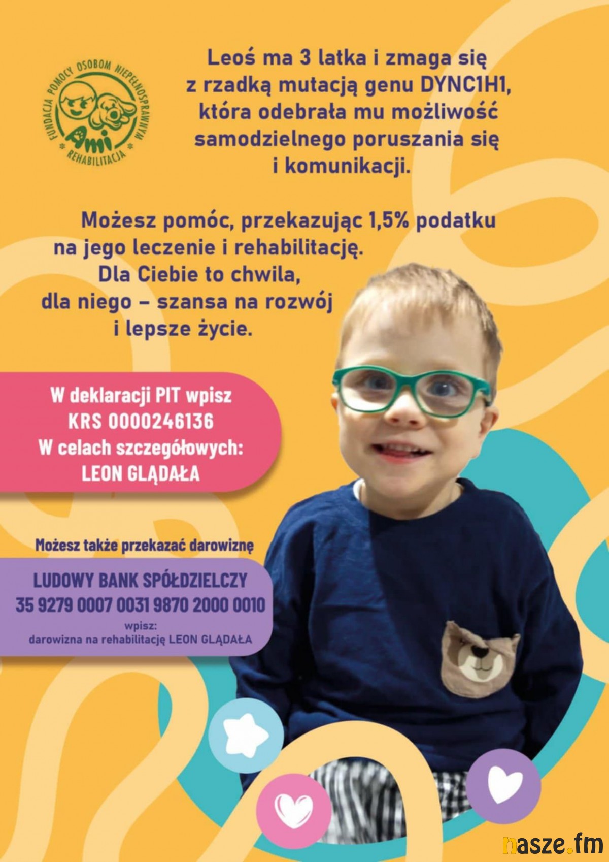 Leon cierpi na bardzo rzadką mutację genu DYNC1H1, która odebrała mu możliwość samodzielnego poruszania się i komunikacji. Można mu pomóc przekazując 1,5% podatku w deklaracji PIT. Szczegóły na zdjęciu poniżej.