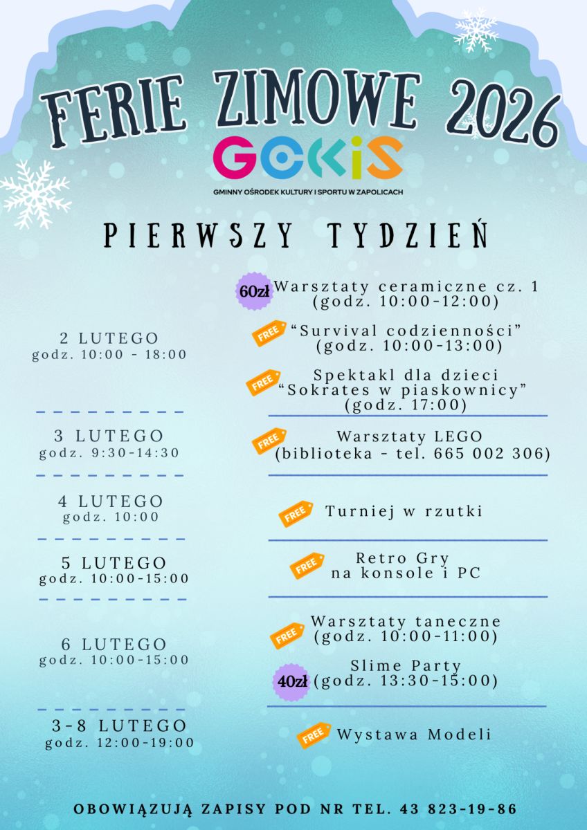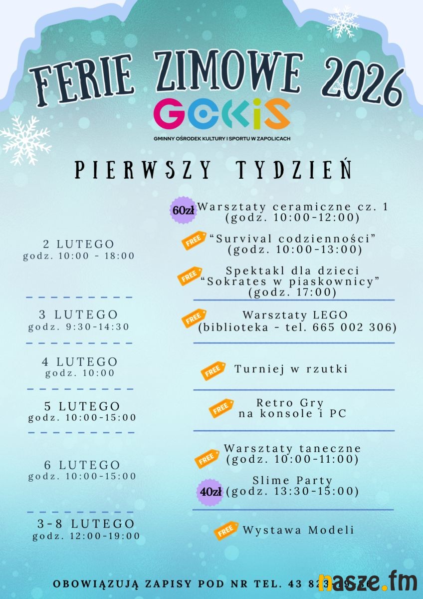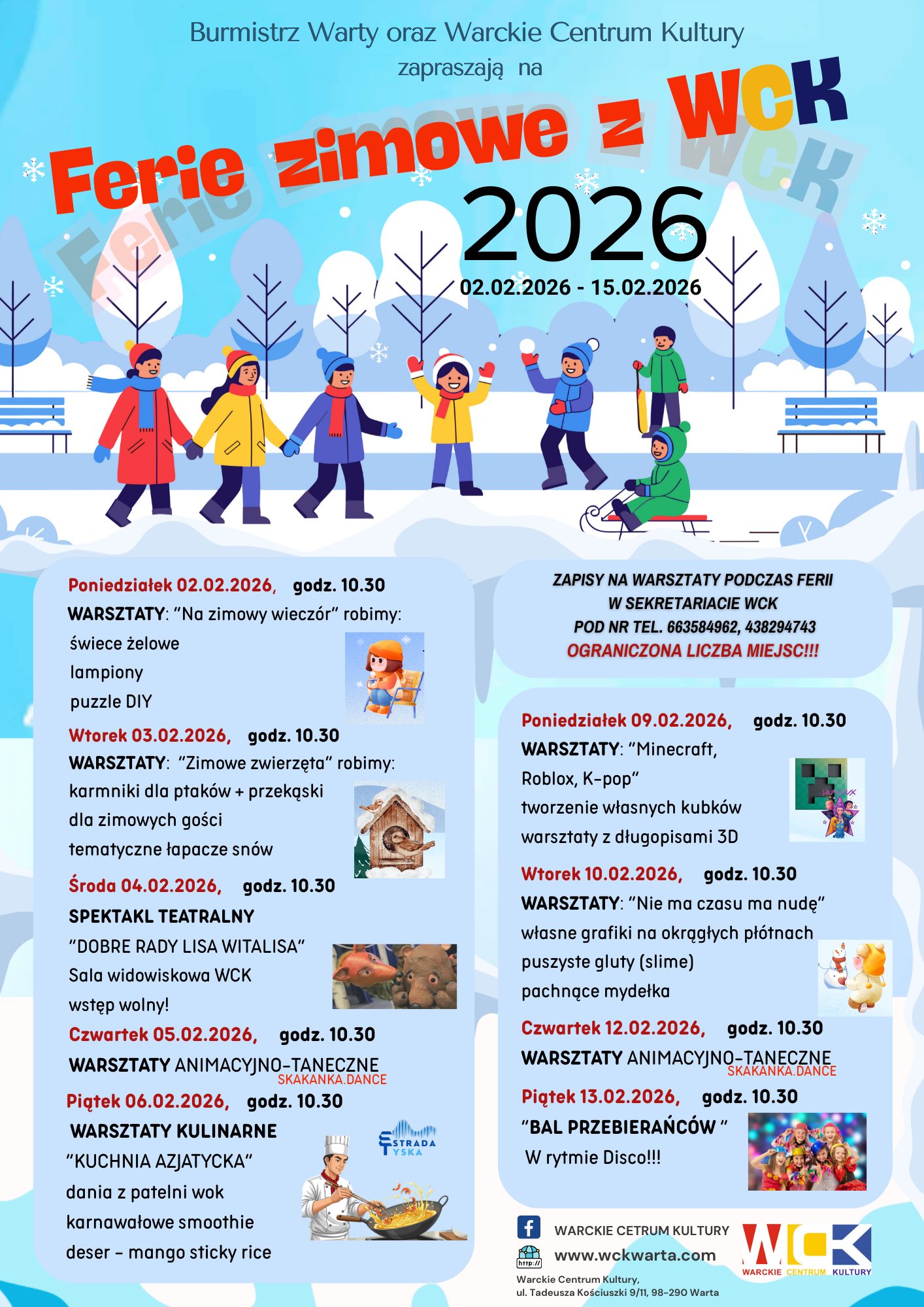 Burmistrz Warty oraz Warckie Centrum Kultury zapraszają dzieci i młodzież na pełne atrakcji Ferie Zimowe z WCK od 2 do 13 lutego 2026 r. W programie m.in.: kreatywne warsztaty DIY, zimowe zwierzęta i karmniki dla ptaków, spektakl teatralny, warsztaty animacyjno?taneczne, warsztaty kulinarne – kuchnia azjatycka, Minecraft, Roblox, K?pop, grafiki, slime, pachnące mydełka, bal przebierańców w rytmie Disco.