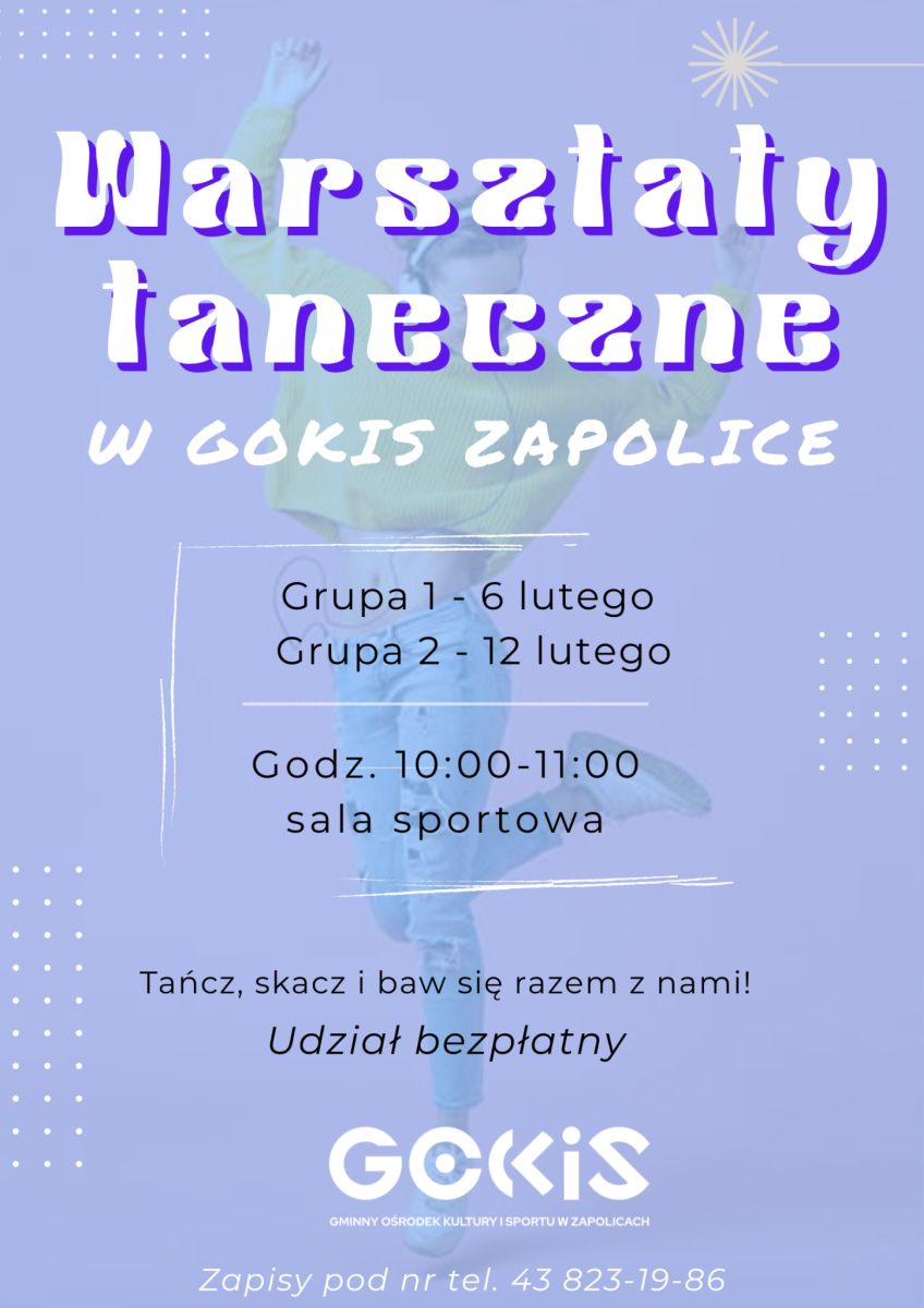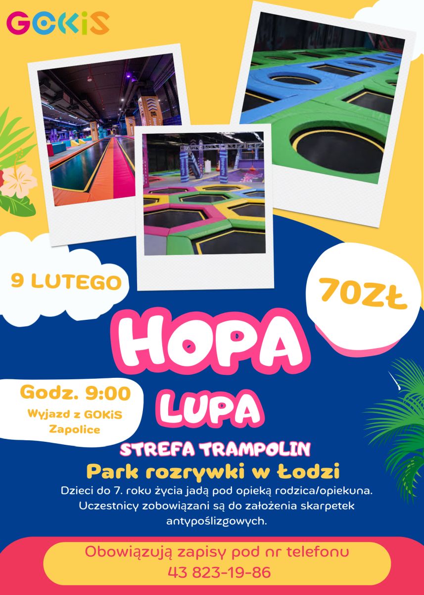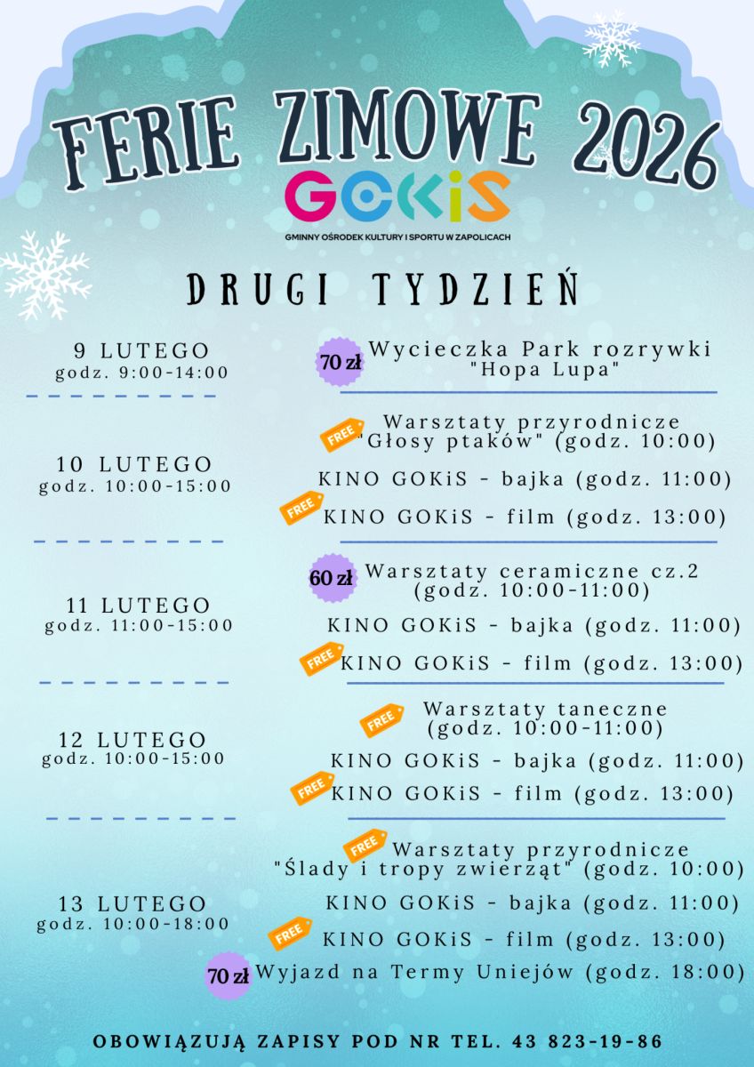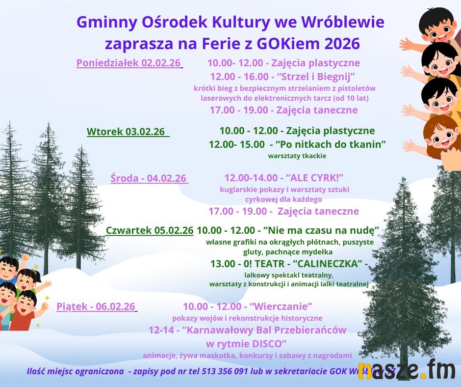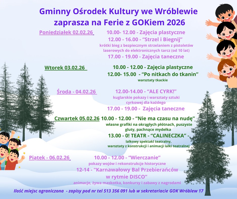 Gminny Ośrodek Kultury we Wróblewie zaprasza młodzieź na ferie z GOKiem. Ferie będą miały mnóstwo atrakcji zaczynając od 2 lutego do 6 lutego. W programie będą m.in.: zajęcia plastyczne, "strzel i biegnij", zajęcia plastyczne, warsztaty tkackie , kuglarskie pokazy i warsztaty sztuki cyrkowej, zajęcia taneczne, zajęcia "Nie ma czasu na nudę", O! TEATR - "CALINECZKA", pokazy wojów i rekonstrukcje historyczne i "Karnawałowy Bal Przebierańców w rytmie DISCO".