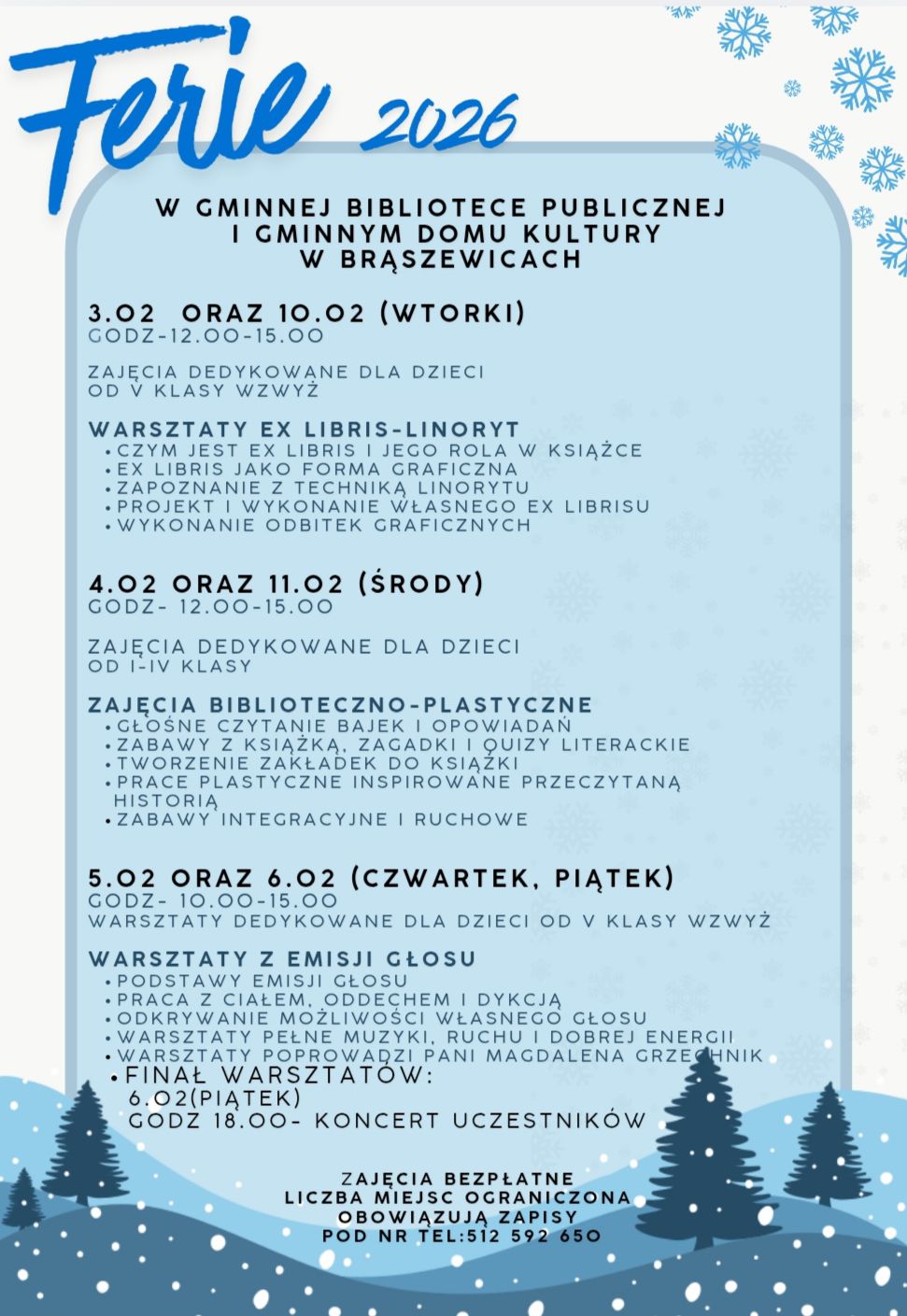 Gminna Biblioteka Publiczna i Dom Kultury w Brąszewicach zapraszają dzieci z terenu gminy do wspólnego spędzenia ferii zimowych. Zajęcia odbywają się od 3 lutego do 6 lutego oraz 10 lutego do 11 lutego i są dla dzieci w różnych grupach wiekowych. W programie m.in.: warsztaty z emisji głosu, które poprowadzi Magdalena Grzechnik i będą zakończone finałowym koncertem uczestników, oraz warsztaty artystyczne i plastyczne, zajęcia biblioteczne i kreatywne.