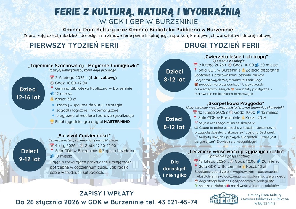 Gminny Dom Kultury oraz Gminna Biblioteka Publiczna w Burzeninie zapraszają dzieci, młodzież i dorosłych na zimowe ferie z kulturą, naturą i wyobraźnią. Kreatywne warsztaty będą od 2 lutego do 12 lutego. W programie m.in.: szachy, zagadki logiczne i matematyczne, zajęcia rozwijające praktyczne umiejętności, spotkanie z pracownikami Zespołu Parków Krajobrazowych Województwa Łódzkiego, pogadanka przyrodnicza, ciekawostki o zwierzętach leśnych, warsztaty plastyczne czy szycie własnego misia ze skarpetki.