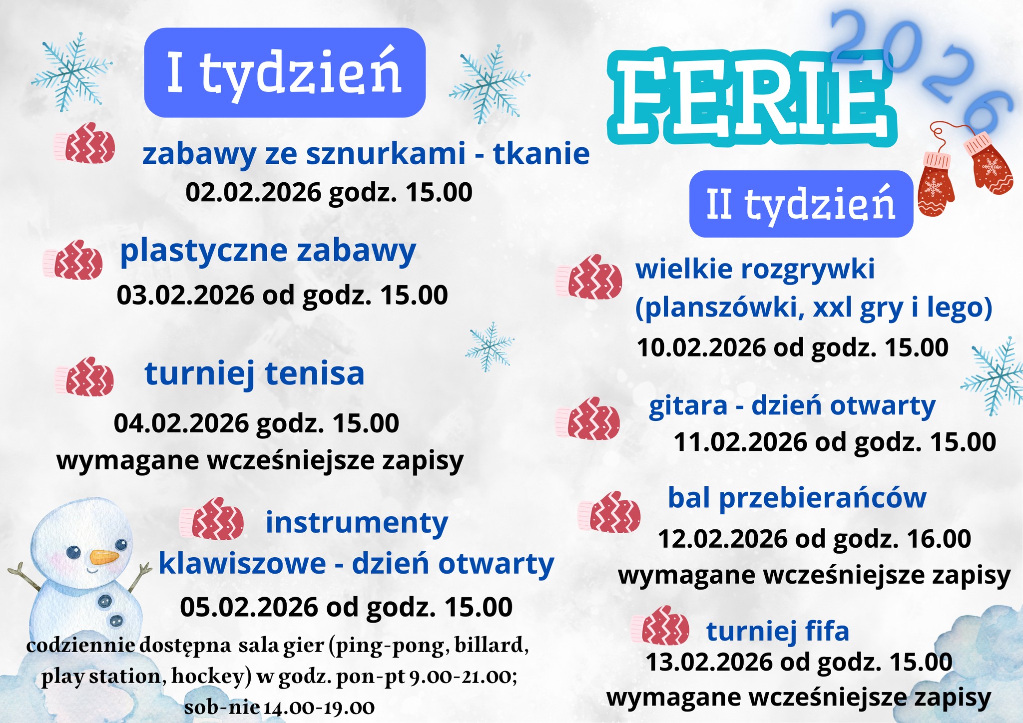 MOK Złoczew zaprasza młodzież na zajęcia w czasie ferii. Te świetne atrakcje bedą od 2 lutego do 13 lutego. W programie m.in.: Zabawy ze sznurkami - tkanie, plastyczne zabawy, turniej tenisa, instrumenty klawiszowe - dzień otwarty, wielkie rozgrywki (planszówki, xxl gry i lego), gitara - dzień otwarty, bal przebierańców i turniej fifa.
