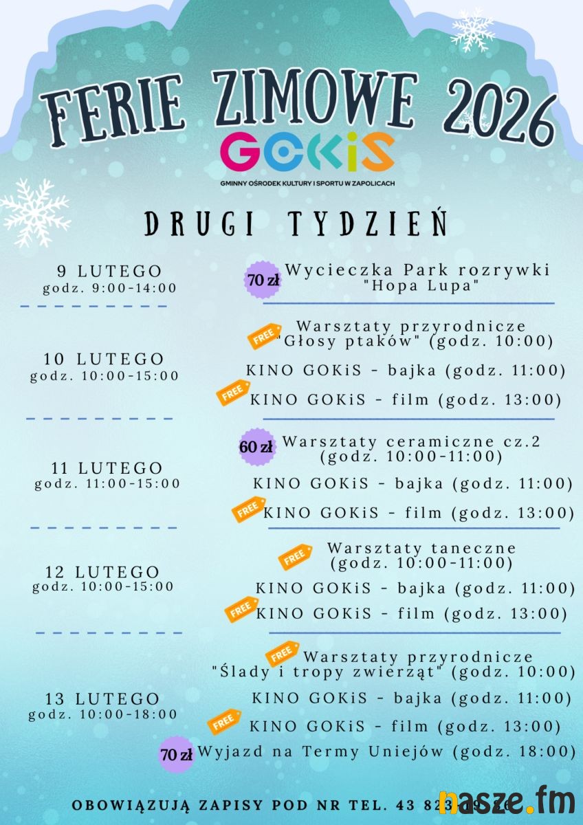W Zduńskiej Woli ferie upłyną pod znakiem aktywności i kreatywnej zabawy. Miejskie domy kultury, biblioteki oraz szkoły oferują warsztaty plastyczne, teatralne i muzyczne, a także spotkania tematyczne i zajęcia integracyjne. Równie atrakcyjnie zapowiadają się ferie w Sieradzu. Tamtejsze instytucje kultury i sportu przygotowały programy łączące zabawę z nauką. W planach są m.in. warsztaty rękodzielnicze, zajęcia edukacyjne, seanse filmowe oraz spotkania z ciekawymi gośćmi.