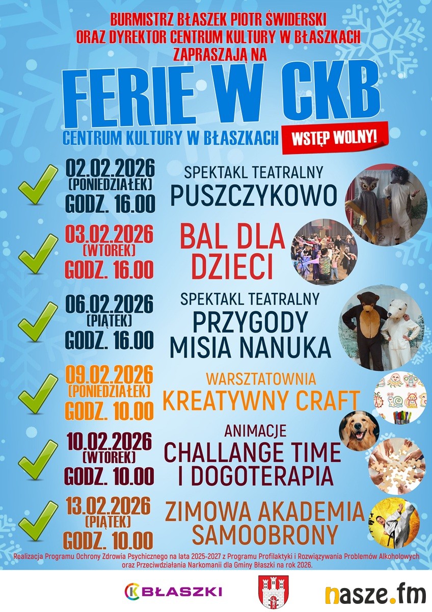 Burmistrz Błaszek Piotr Świderski oraz dyrektor Centrum Kultury w Błaszkach zapraszają na ferie zimowe w Centrum Kultury w Błaszkach. W programie m.in.: spektakl teatralny Puszczykowo, bal dla dzieci, spektakl teatralny przygody misia Nanuka, warsztatownia Kreatywny Craft, animacje Challenge Time i Dogoterapia, Zimowa Akademia Samoobrony. Zajęcia rozpoczynają się o godz. 16 w pierwszym tygodniu ferii, w drugim tygodniu zajęcia będą o godzinie 10. Wstęp wolny.