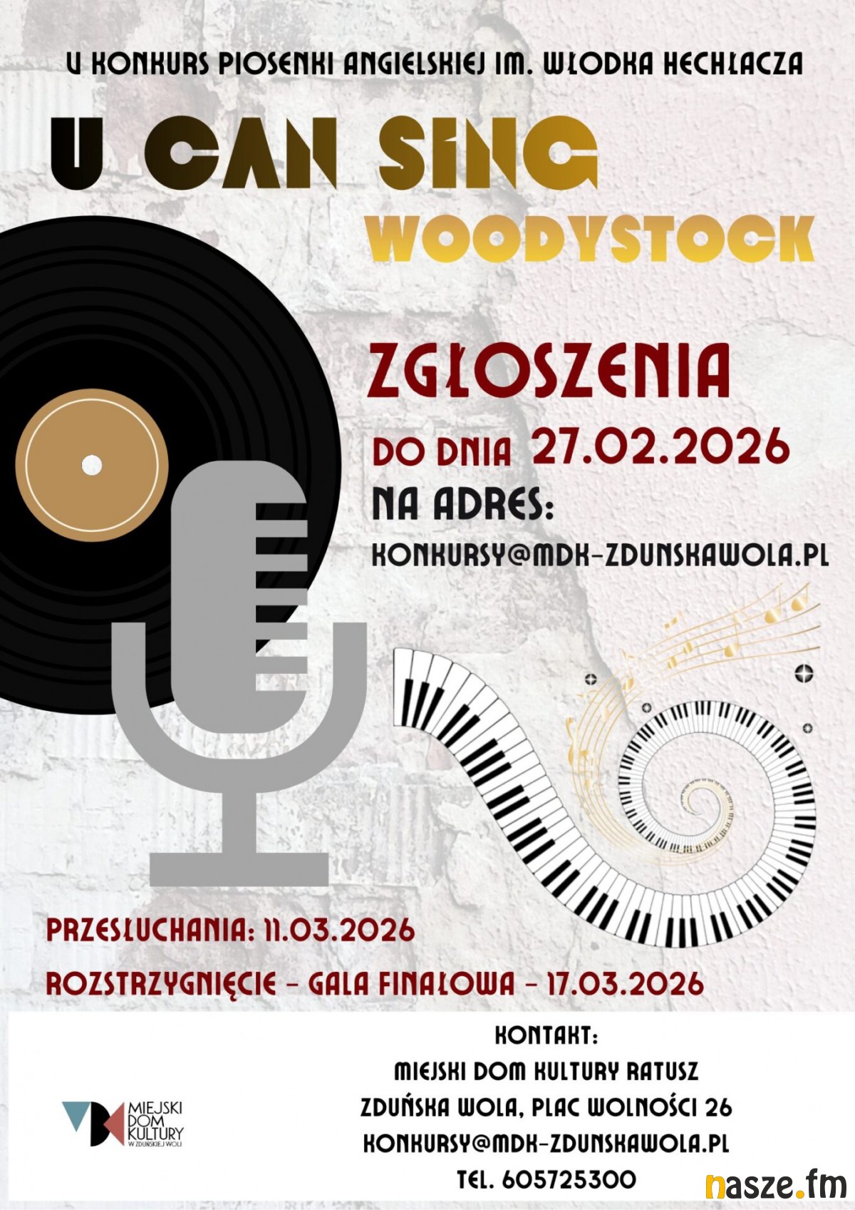 Zgłoszenia do V Konkursu Piosenki Angielskiej im. Włodka Hechłacza "U Can Sing - Woodystock" przyjmowane są do 27 lutego. Przesłuchania zaplanowano na 11 marca, gala finałowa będzie 17 marca. Organizatorem konkursu jest Miejski Dom Kultury w Zduńskiej Woli.
