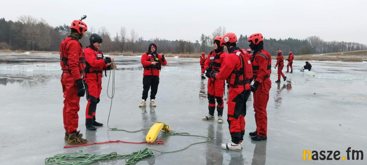 - Pierwszy scenariusz to akcja z tak zwanym sprzętem przygodnym. Mówimy tutaj o sankach, mówimy tutaj o jakichś długich elementach w postaci liny, sznura, czyli wszystkie te rzeczy, które przygodne osoby przebywające nad zbiornikami, mogą wykorzystać do udzielenia pomocy. Drugi scenariusz to już typowy ratownik. Ratownik ubrany w odpowiedni sprzęt, w kask, w suchy skafander, w kolce do przemieszczania się po lodzie, musi w odpowiedni sposób dotrzeć do poszkodowanego, opanować, wpiąć go w pas ratowniczy typu węgorz i przez kolejnego ratownika jest holowany na brzeg. Trzecia procedura z użyciem deski ortopedycznej, gdzie deska zmniejsza nam nacisk punktowy na lód i ratownik przez przesuwanie deski przesuwa się po tym lodzie i dociera do poszkodowanego - wyjaśnia Patryk Sokal.