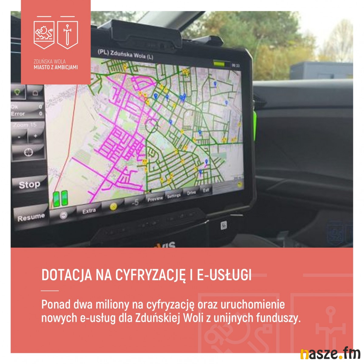 Zduńskowolski projekt znalazł się na liście wybranych do dofinansowania w naborze Fundusze Europejskie dla innowacyjnego Łódzkiego. Miasto otrzyma 2.242.963,43 zł na zadanie pod nazwą "Nowoczesne zarządzanie krajobrazem i infrastrukturą drogową poprzez inwentaryzację zasobów i budowę baz danych przestrzennych oraz uruchomienie nowych e-usług w mieście Zduńska Wola". Wydatki ogółem na ten projekt to 2.638.780,50 zł.