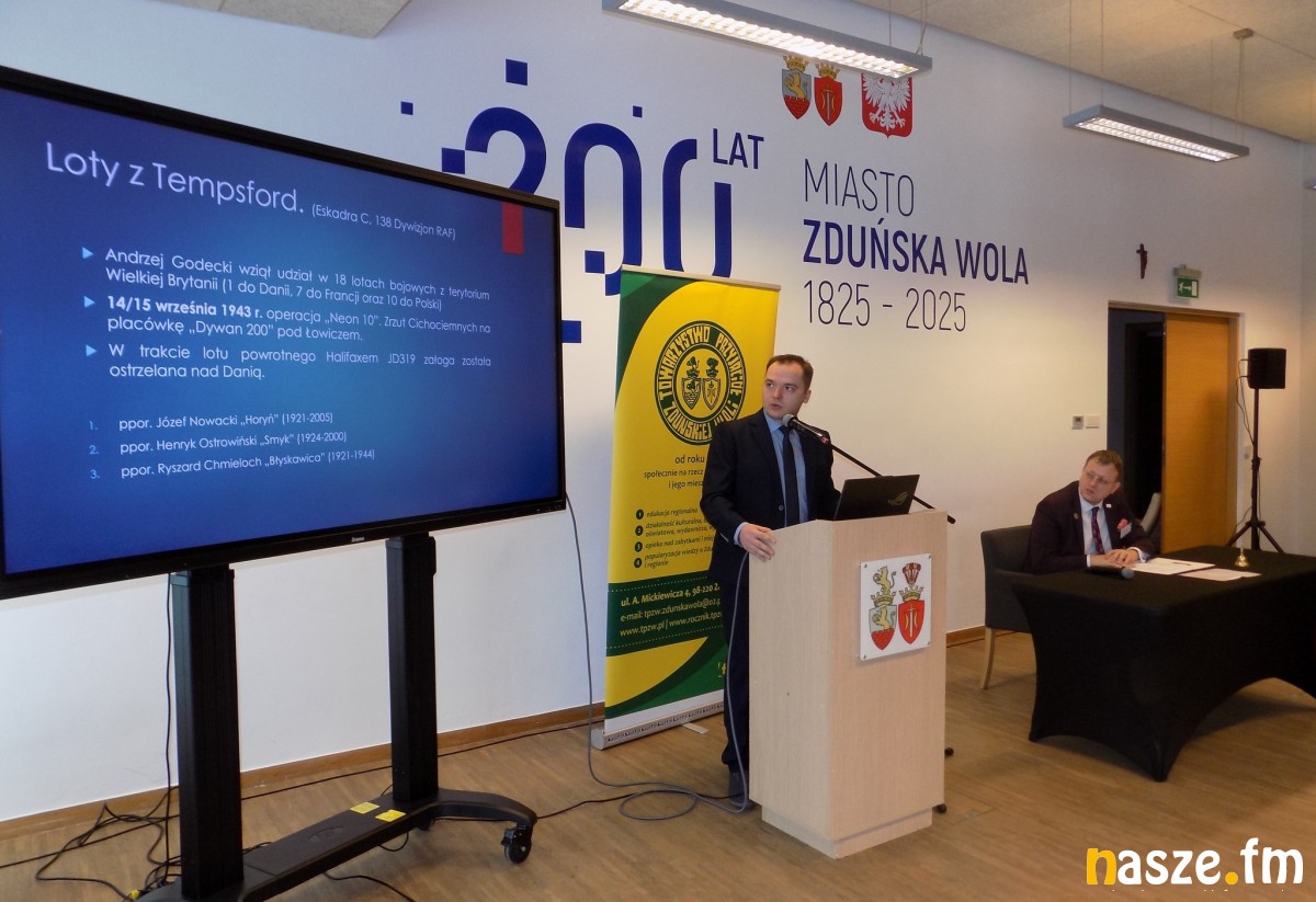 Po przerwie kawowej dr hab. prof. Piotr Gołdyn z Uniwersytetu Kaliskiego im. Prezydenta Stanisława Wojciechowskiego omówił patronów zduńskowolskich w okresie Polskiej Rzeczypospolitej Ludowej, a Daniel Buszyński z Muzeum Historii Miasta Zduńska Wola przybliżył niezwykle ciekawe losy urodzonego w mieście Andrzeja Godeckiego - strzelca pokładowego Polskich Sił Powietrznych.