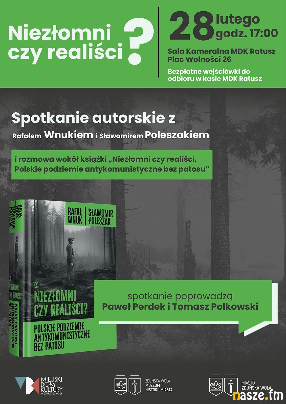 Miejski Dom Kultury Ratusz i Muzeum Historii Miasta Zduńska Wola zapraszają na spotkanie poświęcone książce Rafała Wnuka i Sławomira Poleszaka "Niezłomni czy realiści. Polskie podziemie antykomunistyczne bez patosu". Rozmowę z autorami poprowadzą Paweł Perdek i Tomasz Polkowski.