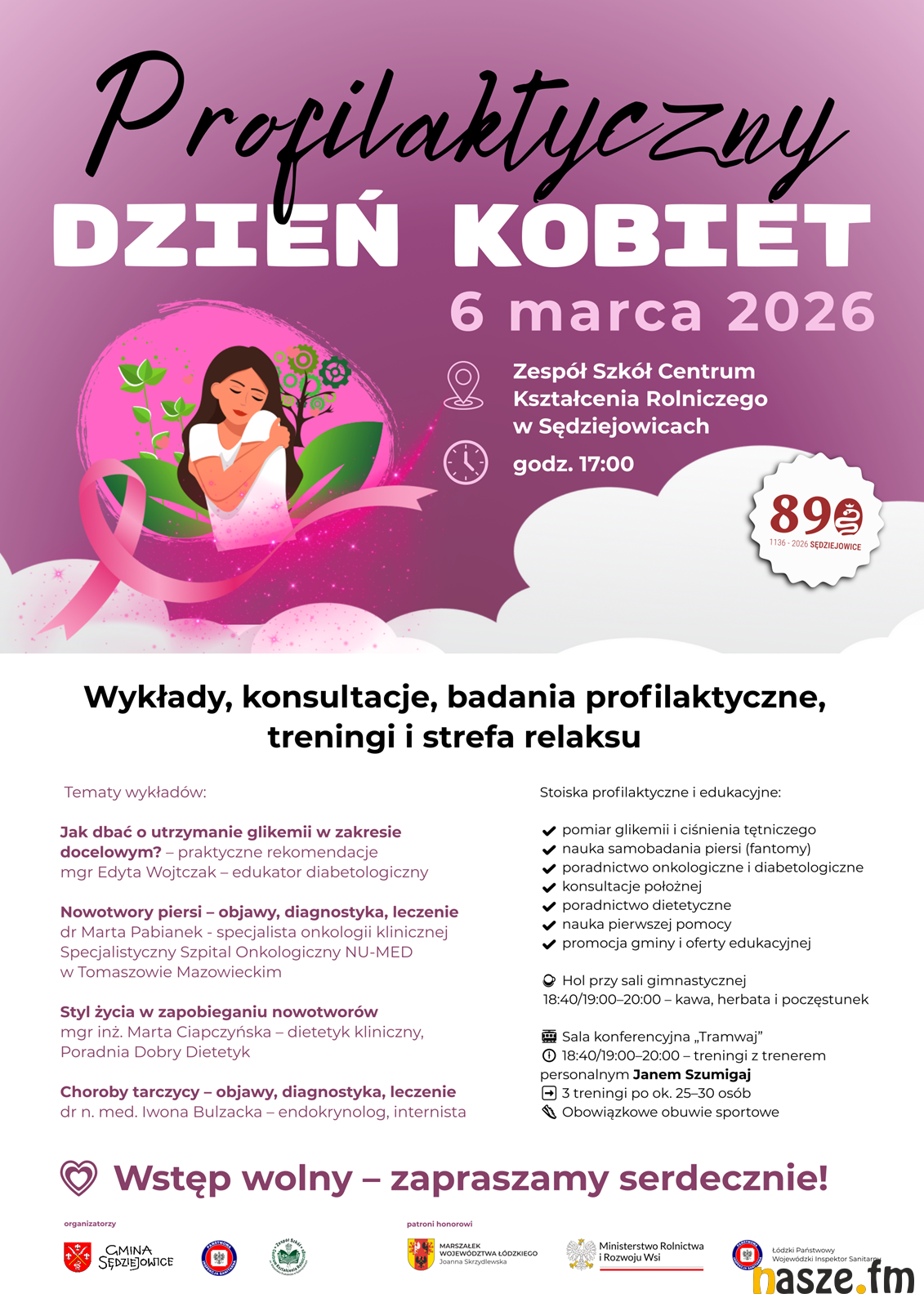 Oficjalne otwarcie wydarzenia zaplanowano na godzinę 17:00 w sali gimnastycznej. Tuż po nim rozpoczną się wykłady profilaktyczne prowadzone przez doświadczonych specjalistów z zakresu diabetologii, onkologii, dietetyki i endokrynologii. Uczestniczki dowiedzą się m.in., jak utrzymywać prawidłowy poziom glikemii, jakie są objawy i metody diagnostyki nowotworów piersi, w jaki sposób styl życia wpływa na profilaktykę nowotworową oraz jak rozpoznawać i leczyć choroby tarczycy.