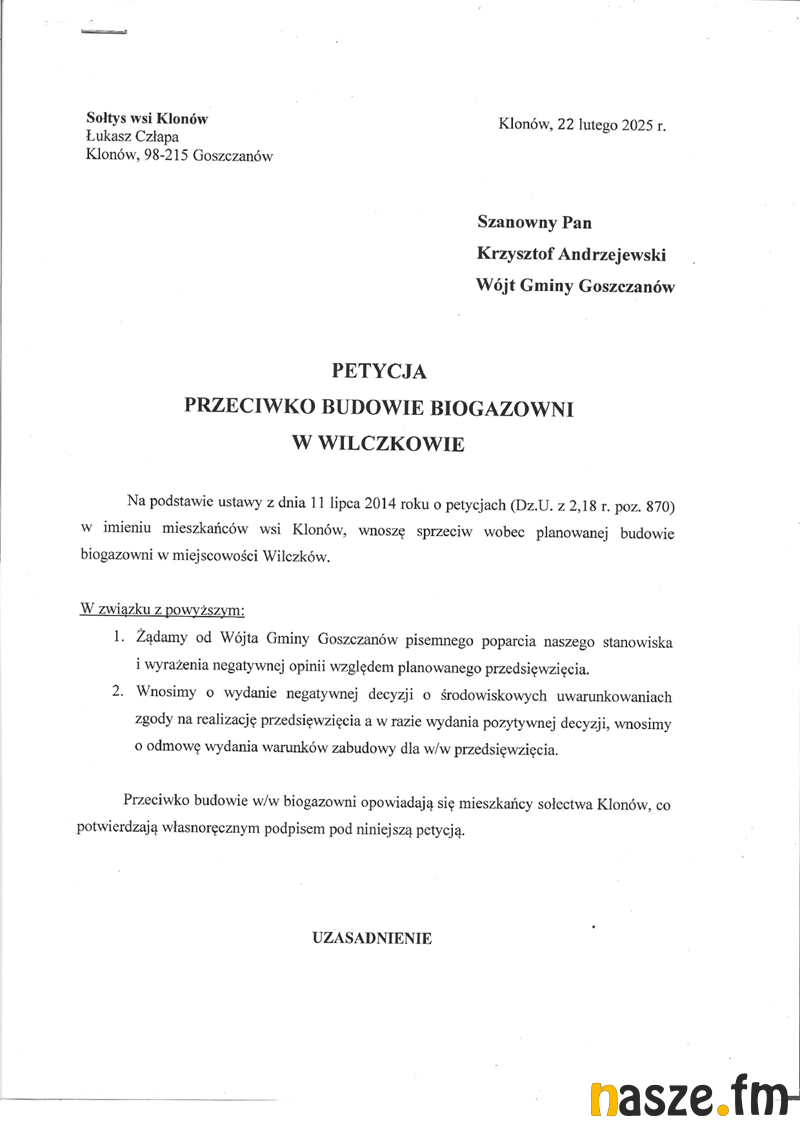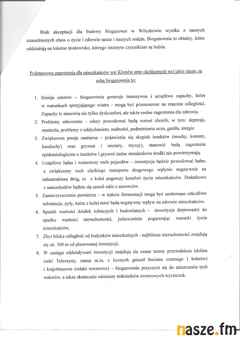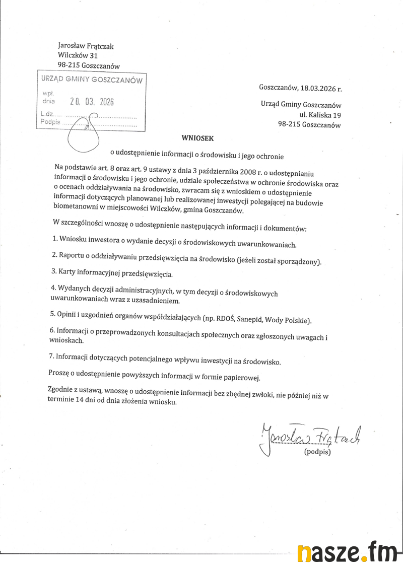 Dzień dobry chciałem zapytać o możliwość podjęcia tematu przez Nasze Radio planowanej inwestycji budowy dużej biometanowni we wsi Wilczków gmina Goszczanów. Planowana jest inwestycja na którą my mieszkańcy wsi Wilczków i okolic się nie zgadzamy. Sama inwestycja budzi nasz sprzeciw ze względu na ogromne natężenie ruchu samochodów ciężarowych z substratem i padliną zwierzęcą która jak można się domyśleć będzie emitowała ogromny fetor na dużą odległość planowany przerób roczny to około 150 tysięcy ton, do naszej wsi prowadzą drogi które są w złym stanie a powstanie tak duże natężenie samochodów ciężarowych, że problemem będzie wyjazd z posesji dla nas i każdego rolnika chcącego dojechać do pola ciągnikiem, takie natężenie ruchu całkowicie uniemożliwi poruszanie się pieszo, oraz osobom na wózkach inwalidzkich i osobom niepełnosprawnym które są mieszkańcami naszej wsi. Gmina wysłała wniosek o decyzji środowiskowych 17 grudnia 2025 roku czyli jeszcze nie jest za późno, żeby interweniować. Problemem przy budowie tej biometanowni jest fakt, że planami inwestycji zajmuje się Spółka z.o.o we Wrocławiu która po pozytywnym załatwieniu wszelkich formalności może odsprzedać projekt komu zechce. W razie jakiejkolwiek dużej awarii lub skażenia terenu taka spółka zawinie się stąd przykładem mogą posłużyć nielegalne wysypiska śmieci w Polsce gdzie wszyscy się domyślamy co się z tym dzieję i jak się to kończy. Liczymy na waszą pomoc gdyż chcemy jeszcze mieszkać w pięknej zielonej okolicy w pobliżu znajduje się obszar NATURA 2000 jest tu dużo dzikiej zwierzyny i ptactwa które są pod ochroną. Czekamy z niecierpliwością na pozytywne rozpatrzenie naszego maila i odpowiedź.