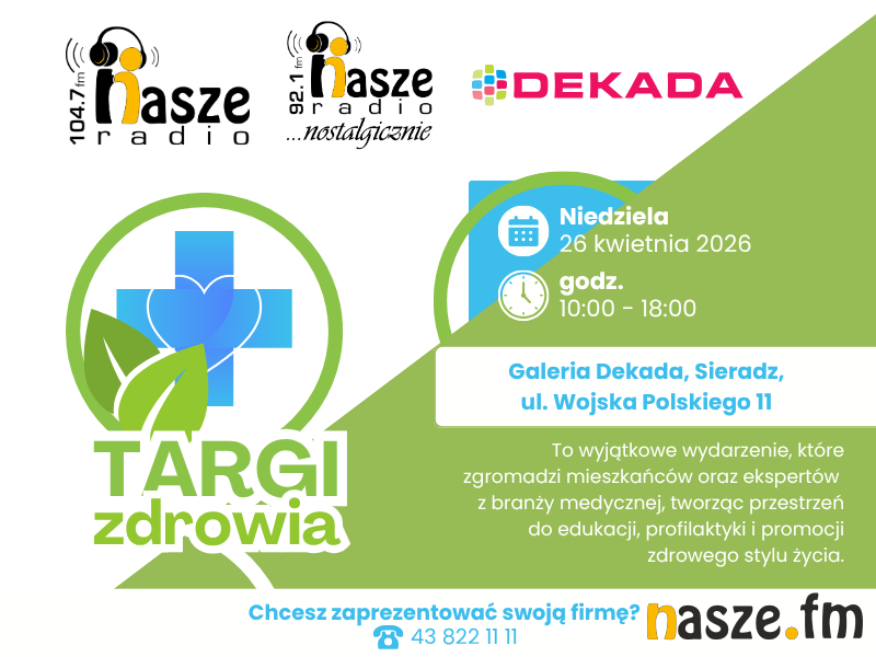 Zapraszamy do współpracy przy Targach - masz firmę z szeroko rozumianej branży medycznej, zdrowotnej - zadzwoń , porozmawiajmy o możliwościach promocji 43 822 11 11. Możesz też napisać do nas na adres reklama@nasze.fm.