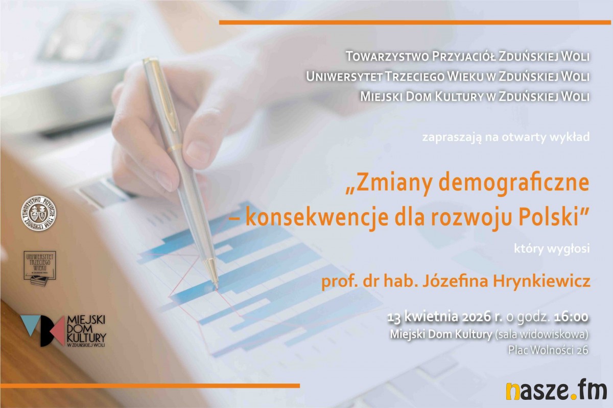 Towarzystwo Przyjaciół Zduńskiej Woli, Uniwersytet Trzeciego Wieku w Zduńskiej Woli i Miejski Dom Kultury w Zduńskiej Woli zapraszają na otwarty wykład pt. "Zmiany demograficzne - konsekwencje dla rozwoju Polski".
