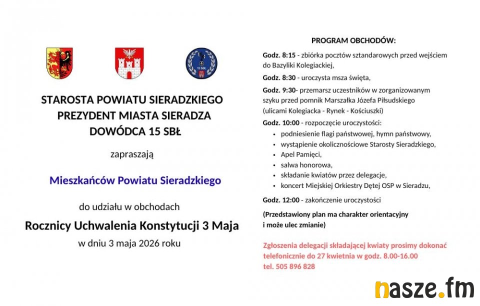 Hufiec ZHP Sieradz, 15. Sieradzka Brygada Łączności oraz Urząd Miasta Sieradza zapraszają o godz. 11:00 na plac przy pomniku Marszałka Józefa Piłsudskiego. Wspólnie z mieszkańcami Sieradza rozciągnięta będzie 20-metrowa flaga w barwach narodowych oraz odśpiewany hymn państwowy.