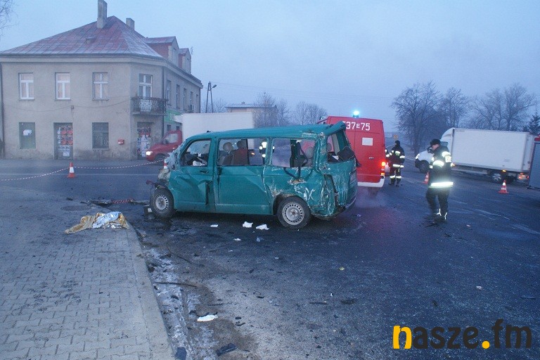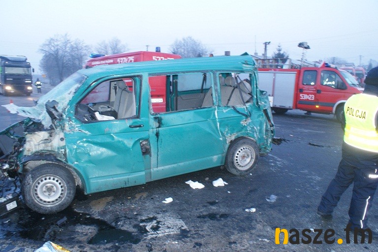 Jak nas poinformował oficer dyżurny Państwowej Straży Pożarnej w Sieradzu do tego zdarzenia doszło kilkanaście minut po godz. 5.00 rano. Kierowca wyjeżdżający z podporządkowanej drogi nr 449 wymusił pierwszeństwo przejazdu i doprowadził do zderzenia z tirem przewożącym złom. Zgodnie z ustaleniami policji 33-letni mieszkaniec Zgierza doprowadził do zderzenia, bo na chwilę przysnął za kierownicą. Bus jechał z Niemiec. W wyniku wypadku rannych zostało siedem osób z vw i kierowca ciężarówki. Część poszkodowanych osób opuściła już szpital. Ruch na skrzyżowaniu krajowej nr 12 z drogą 449 był utrudniony przez prawie 5 godzin. Początkowo policja zorganizowała objazd; potem ruch puszczano wahadłowo. Straty oszacowano na 100 tys. zł. Obaj kierowcy byli trzeźwi. Sprawcy wypadku grożą 3 lata pozbawienia wolności.