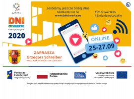 Dni Otwarte Funduszy Europejskich - Łódzkie zaprasza! Dni Otwarte Funduszy Europejskich to największe wydarzenie związane z Funduszami Europejskimi w Polsce. W tym roku odbywać się będzie już po raz siódmy, w wyjątkowej odsłonie - online! Bądź z nami podczas kulminacyjnego weekendu 25 - 27 września 2020 roku na www.dniotwarte.eu, oglądaj programy na żywo, weź udział w koncertach, warsztatach i konkursach z nagrodami! Na wydarzenie zaprasza Marszałek Województwa Łódzkiego Grzegorz Schreiber.