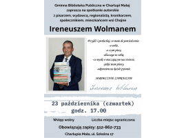Gminna Biblioteka Publiczna w Charłupi Małej (gm. Sieradz, pow. sieradzki) zaprasza na ciekawe spotkanie autorskie. Gościem książnicy będzie Ireneusz Wolman, pisarz, kronikarz i wydawca wywodzący się z msc. Chojne w tejże gminie.