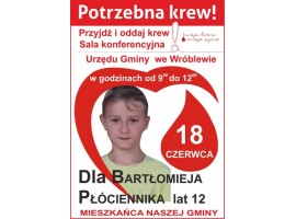 Po raz kolejny potrzebni są honorowi dawcy krwi. Tym razem płyn życia jest potrzebny dla 12-letniego Bartka, który walczy z chorobą.