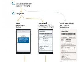 Od dziś recepty w Polsce – z kilkoma, ściśle określonymi wyjątkami – będą mogły być wystawiane wyłącznie elektronicznie. Pacjent otrzyma informację o e-recepcie w postaci: SMS-a z 4-cyfrowym kodem dostępu, lub/i e-maila z załączoną w PDF-ie informacją o e-recepcie albo wydruku informacyjnego.