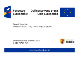 Od 1 września 2024 roku do 31 sierpnia 2026 roku Powiatowy Zespół Szkół nr 1 w Sieradzu będzie realizował w imieniu Powiatu Sieradzkiego projekt numer FELD.08.08-IZ.00-0048/23 pod nazwą "Mój zawód moja przyszłość", współfinansowanego ze środków Europejskiego Funduszu Społecznego Plus w ramach programu Fundusze Europejskie dla Łódzkiego 2021-2027.