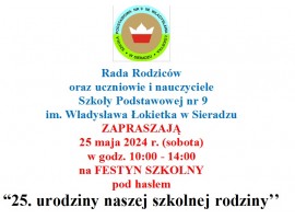 Społeczność szkolna SP nr 9 w Sieradzu zaprasza w najbliższą sobotę na Festyn Szkolny pod hasłem "25. urodziny naszej szkolnej rodziny". W programie wiele atrakcji dla starszych i młodszych. Będzie to też idealna okazja do spotkania i wspólnej zabawy dla absolwentów szkoły.