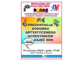 W najbliższy czwartek w Teatrze Miejskim w Sieradzu odbędzie się uroczyste zakończenie roku w kołach i klubach zainteresowań Spółdzielczego Domu Kultury w Sieradzu. Będzie to prezentacja dorobku artystycznego uczestników zajęć. Początek o 17, wstęp wolny
