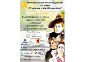 Zespół Szkół Specjalnych w Warcie zaprasza uczniów z niepełnosprawnością intelektualną w stopniu lekkim lub umiarkowanym do udziału w konkursie "W gościnie u Marii Konopnickiej". Konkurs odbędzie się 19 kwietnia w Sali widowiskowej Warckiego Centrum Kultury w Warcie, przy ul. Tadeusza Kościuszki 9/11. Rozpoczęcie planowane jest na godzinę 10.00.