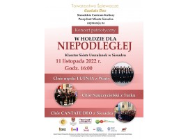 Towarzystwo Śpiewacze "Cantate Deo" wraz z Sieradzkim Centrum Kultury i Prezydentem Miasta Sieradza zapraszają miłośników muzyki chóralnej na koncert pieśni patriotycznej „W hołdzie dla Niepodległej”. Koncert odbędzie się 11 listopada w Klasztorze Sióstr Urszulanek w Sieradzu.