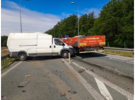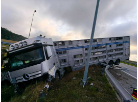 Poranne zdarzenie drogowe na węźle drogi ekspresowej S-8 Sieradz Wschód. Pojazd ciężarowy do przewozu zwierząt uderzył w osłonę energochłonną i wjechał do rowu.