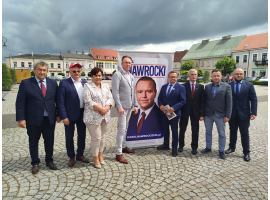Przedstawiciele Prawa i Sprawiedliwości z konferencją prasową na Rynku w Sieradzu. Poprzez lokalne media przekonywali dziś, by w drugiej turze wyborów prezydenckich głosować na Karola Nawrockiego popieranego przez to ugrupowanie polityczne.