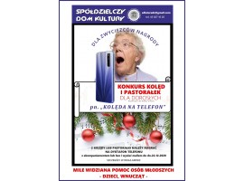 Spółdzielczy Dom Kultury w Sieradzu zaprasza do udziału w konkursie kolęd i pastorałek "Kolęda na telefon". Konkurs skierowany jest dla dorosłych powyżej 30 roku życia. Utwory można wysyłać do 22 grudnia.