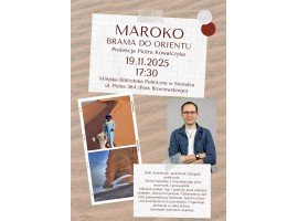 Każdy kto chciały dowiedzieć się czegoś na temat tego kraju może dziś wybrać się do Miejskiej Biblioteki Publicznej w Sieradzu. Prelekcję o Maroku wygłosi tu Piotr Kowalczyk - podróżnik, fotograf, publicysta.
