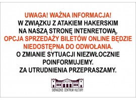 W związku z atakiem hakerskim na stronę internetową Sieradzkiego Centrum Kultury, sprzedaż biletów online będzie niedostępna do odwołania.