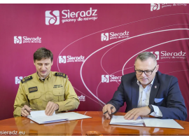 Paweł Osiewała, prezydent Sieradza i st. bryg. Radosław Jadwiszczak podpisali się pod porozumieniem o wsparciu finansowym sieradzkiej Komendy Powiatowej Państwowej Straży Pożarnej w zakupie pojazdu operacyjnego.