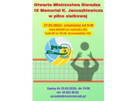 Miejski Ośrodek Sportu i Rekreacji w Sieradzu zaprasza na IX Memoriał Kazimierza Januszkiewicza, który jest jednocześnie Otwartymi Mistrzostwami Sieradza w piłce siatkowej. Trwają zapisy.