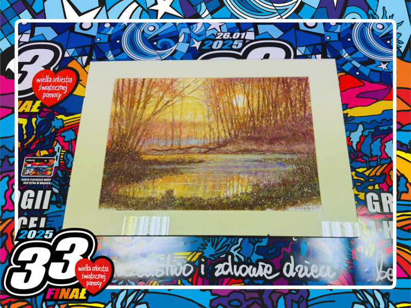 Obraz "Sieradzkie Starorzecze"sprzedane Cena ostateczna: 1850 zł "Sieradzkie Starorzecze" to dzieło wykonane w unikalnej technice mieszanej: tempera, pastel, kredka poly color. Obraz o formacie 54 x 38 cm został oprawiony w passe-partout oraz antyramę o wymiarach 70 x 50 cm. Przedstawia jedno z malowniczych przywarciańskich starorzeczy o wschodzie słońca, oddając wyjątkowy klimat tej scenerii. To szczególne dzieło jest jubileuszową, 30. aukcją autora na rzecz WOŚP, co czyni je jeszcze bardziej symbolicznym i wyjątkowym. To niezwykła praca, która łączy artystyczną wrażliwość z pięknem lokalnej natury. Przekazuje:Cezary Zbrojewski |