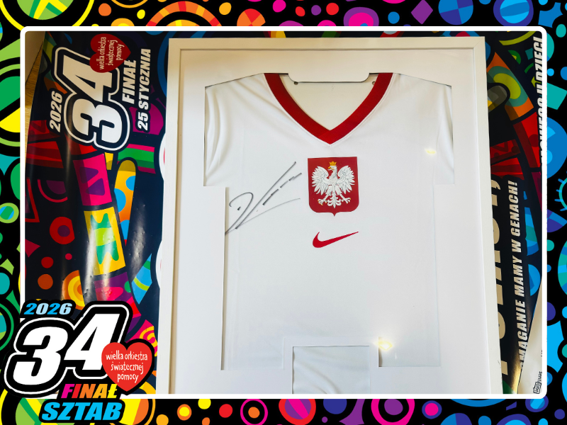 Oryginalna koszulka reprezentacji Polski z autografem kapitana drużyny narodowej Roberta Lewandowskiego.