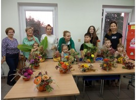 Kolejną propozycją warsztatów dyniowych zorganizowanych w filii Miejskiego Domu Kultury w Karsznicach była kompozycja florystyczna wykonana na owocu dyni. Uczestnicy zajęć poznali tajniki wykonania tego rodzaju jesiennej kompozycji.