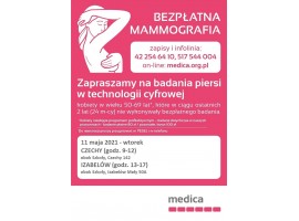 11 maja (wtorek) w godzinach 9.00-12.00 przy Zespole Szkoły Podstawowej i Przedszkola w Czechach oraz od godziny 13.00 przy Szkole Podstawowej w Izabelowie odbędą się bezpłatne badania mammograficzne.