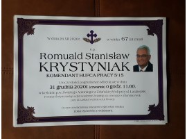 Nie żyje Romuald Krystyniak wieloletni Komendant Hufca Pracy 5-15 w Zduńskiej Woli. Zmarł w wieku 67 lat.