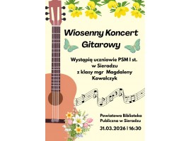 Takie wydarzenie zaplanowano na wtorek w bibliotece powiatowej w Sieradzu. Koncert rozpocznie się o godz. 16:30. Wystąpią uczniowie Państwowej Szkoły Muzycznej I st. w Sieradzu z klasy gitary Magdaleny Kowalczyk.