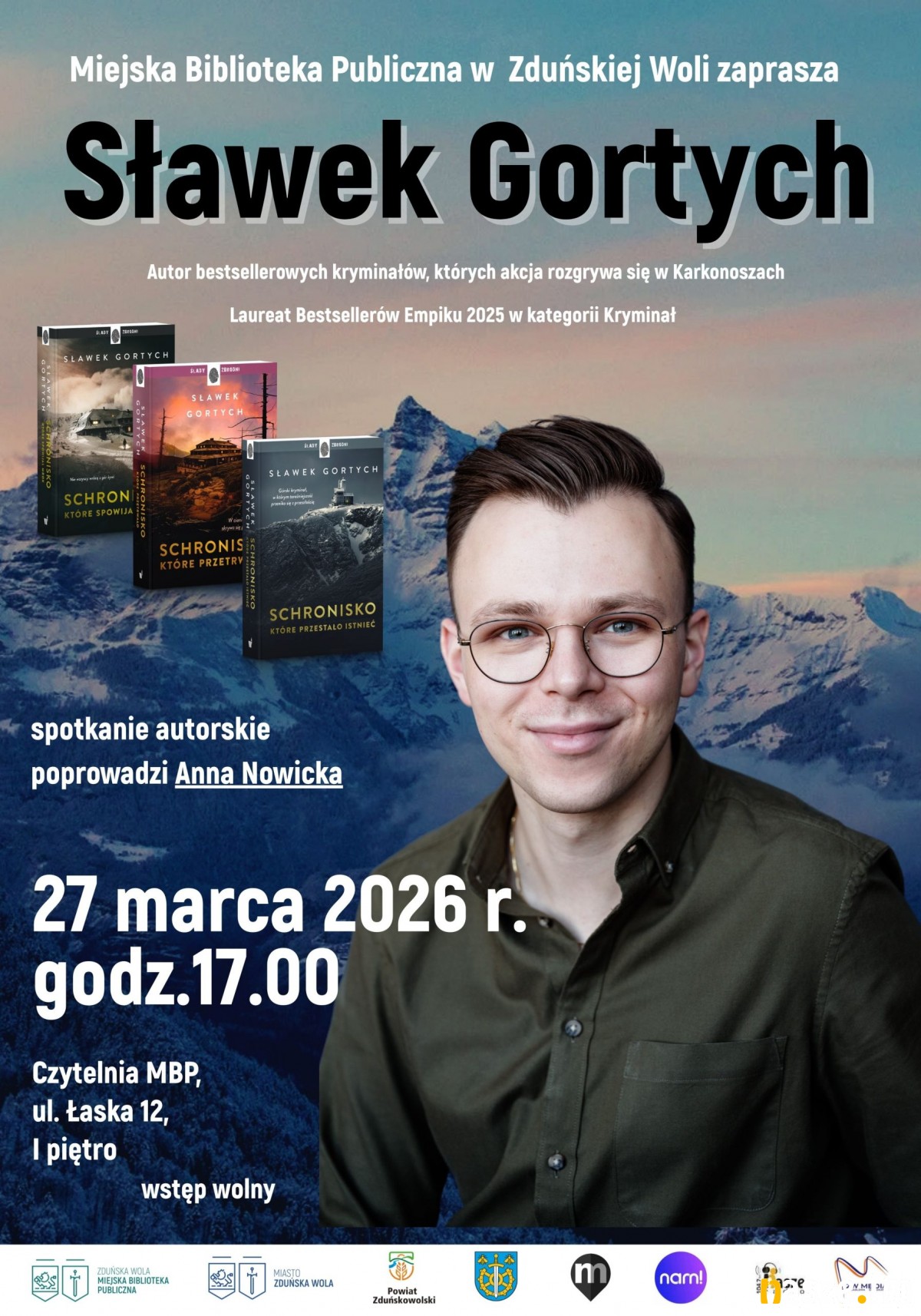 W piątek, 27 marca o godz. 17:00 w Czytelni Miejskiej Biblioteki Publicznej w Zduńskiej Woli będzie można poznać kulisy powstawania Karkonoskiej Serii Kryminalnej, usłyszeć o inspiracjach płynących z górskich wędrówek oraz porozmawiać z autorem o jego literackiej drodze i pasji do historii regionu. Z autorem porozmawia Anna Nowicka.