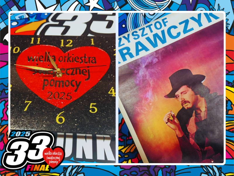 Zegar z granitu oraz Plakat Krzysztofa Krawczyka - rok 1975sprzedane Cena ostateczna: 650 zł Elegancki zegar wykonany z wysokiej jakości granitu o nazwie handlowej Star Galaxy. Zegar o wymiarach 30 x 25 cm wyróżnia się trwałością, estetyką i wyjątkowym charakterem. Na jego powierzchni został wygrawerowany logo 33. Finału WOŚP, co czyni go unikalną i symboliczną pamiątką. To doskonałe połączenie funkcjonalności i wyjątkowego designu, idealne jako ozdoba każdego wnętrza. Unikatowy plakat z 1975 roku przedstawiający legendę polskiej estrady – Krzysztofa Krawczyka. To niezwykle rzadki egzemplarz, którego zachowało się zaledwie kilka sztuk w Polsce. Plakat jest wyjątkowym świadectwem historii polskiej muzyki i doskonałą pamiątką dla fanów oraz kolekcjonerów. Taki przedmiot to nie tylko ozdoba, ale także prawdziwa perełka w każdej kolekcji. Przekazuje:Zakład Kamieniarski Rafał Augustyniak / Krzysztof Bajerski |