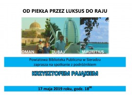 Tak zatytułowane jest spotkanie z podróżnikiem Krzysztofem Pająkiem, który dziś w Powiatowej Bibliotece Powiatowej w Sieradzu opowie o Omanie, Dubaju, Mauritiusie. Początek o godz. 18:00, wstęp wolny.